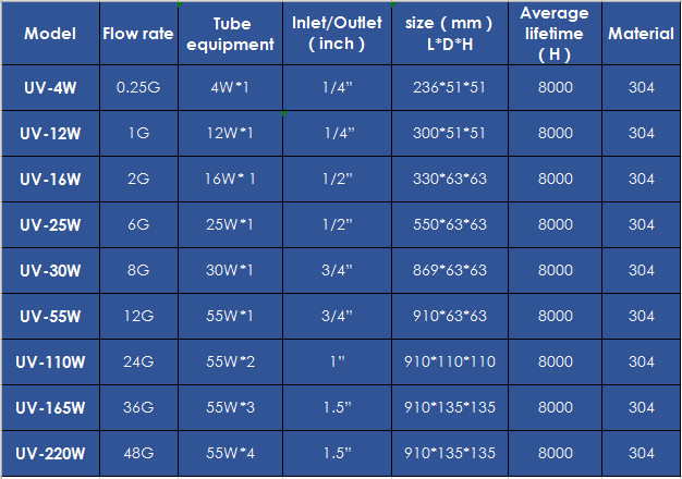 UV sterilizers use the 304# stainless steel inside and outside, the main body internal and external are polished to enhance the UV irradiance. Assembling with the high purity quartz tube, matching with the appropriation uv lamp tube for water treatment, sterilization strong, long lifetime, stable and reliable operation, it's bactericidal efficiency is more than 99%. Lifetime is more than 8000 hours